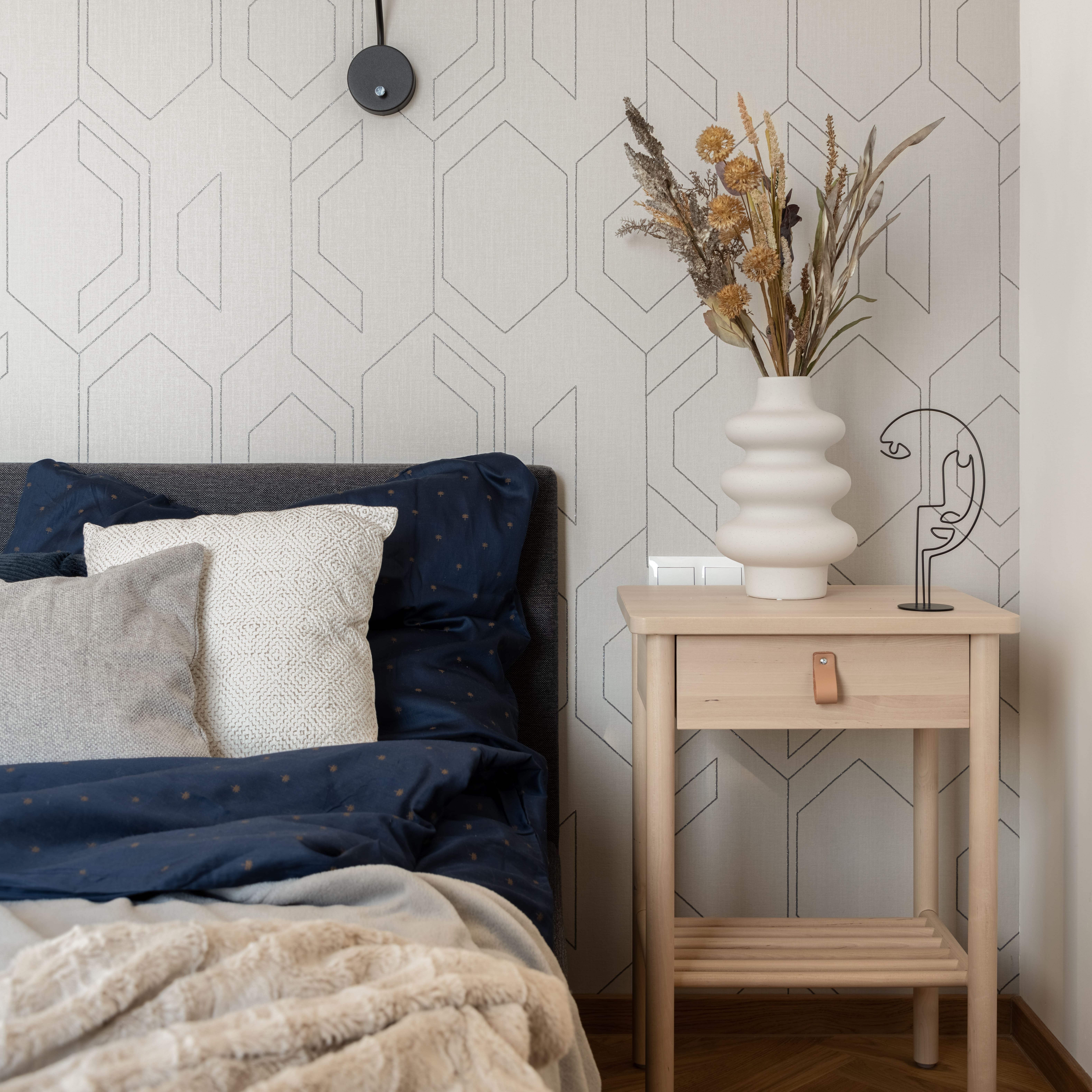 Такие настенные покрытия выглядят очень эффектно, при этом они не перегружают интерьер. Их удобно использовать в небольших по площади и сложных с точки зрения геометрии помещениях, например, слишком узких или имеющих низкий потолок. Узоры, размещённые вертикально, визуально слегка поднимут низкий потолок, а расположение геометрических фигур по горизонтали немного расширит комнату. Модные обои с графическим рисунком не имеют тематической направленности, поэтому они идеально гармонируют не только с современной стилистикой, но и с классическими стилями в интерьере.